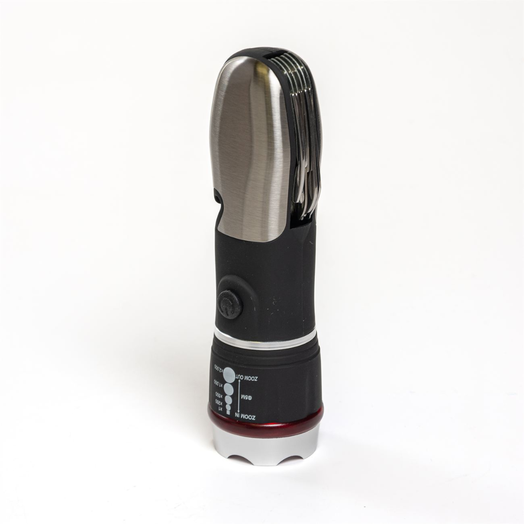 Linterna metálica multifunción, con potente led y zoom para regular la apertura de haz de luz. Opción baliza.