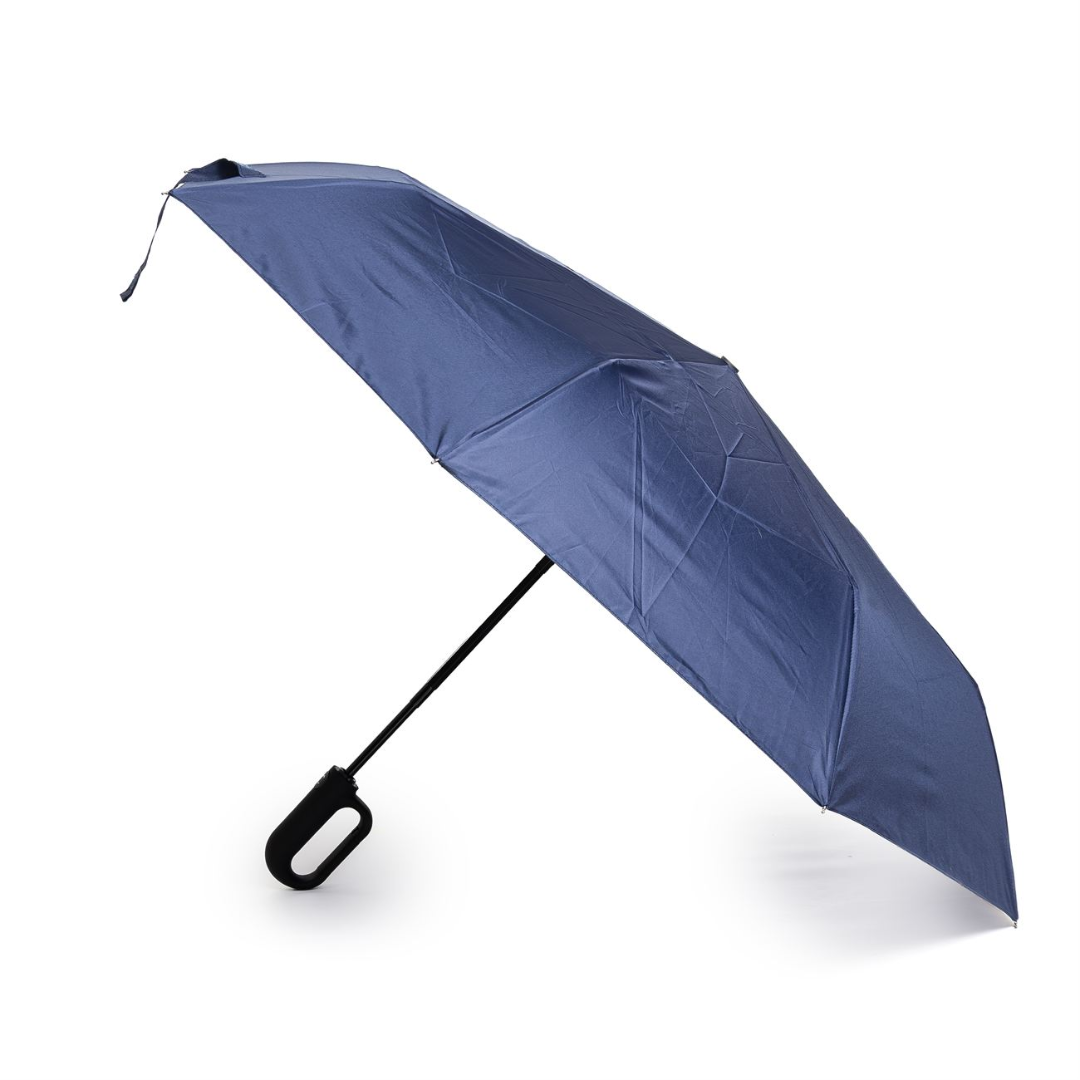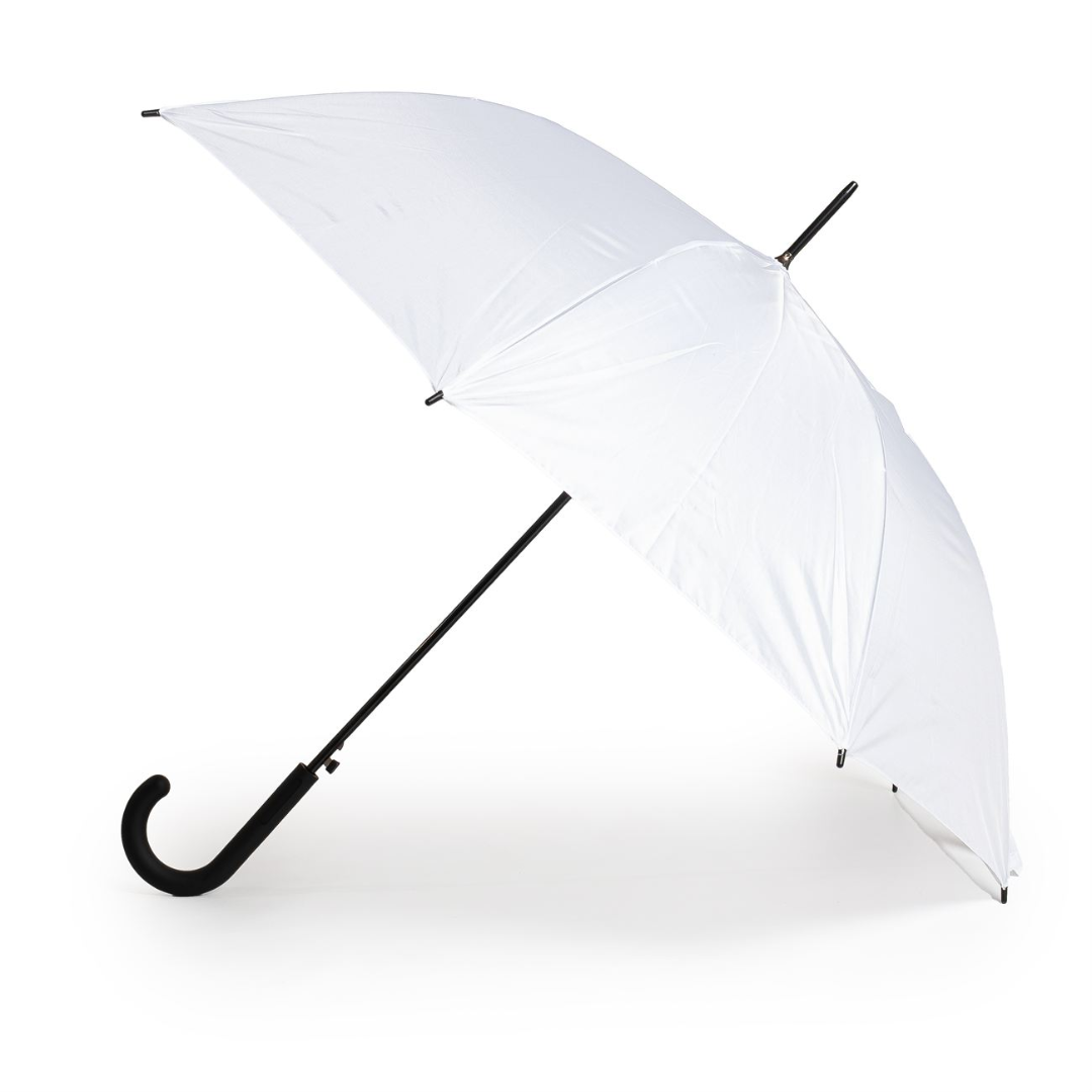 Paraguas tipo ejecutivo de apertura automática. Mango curvo de goma. Vara principal y varillas de apertura metálicas dobles, varillas laterales plásticas, puntera metálica, terminales en plástico.