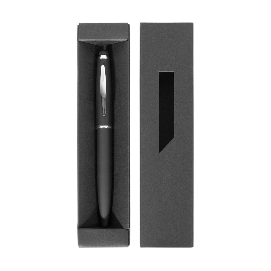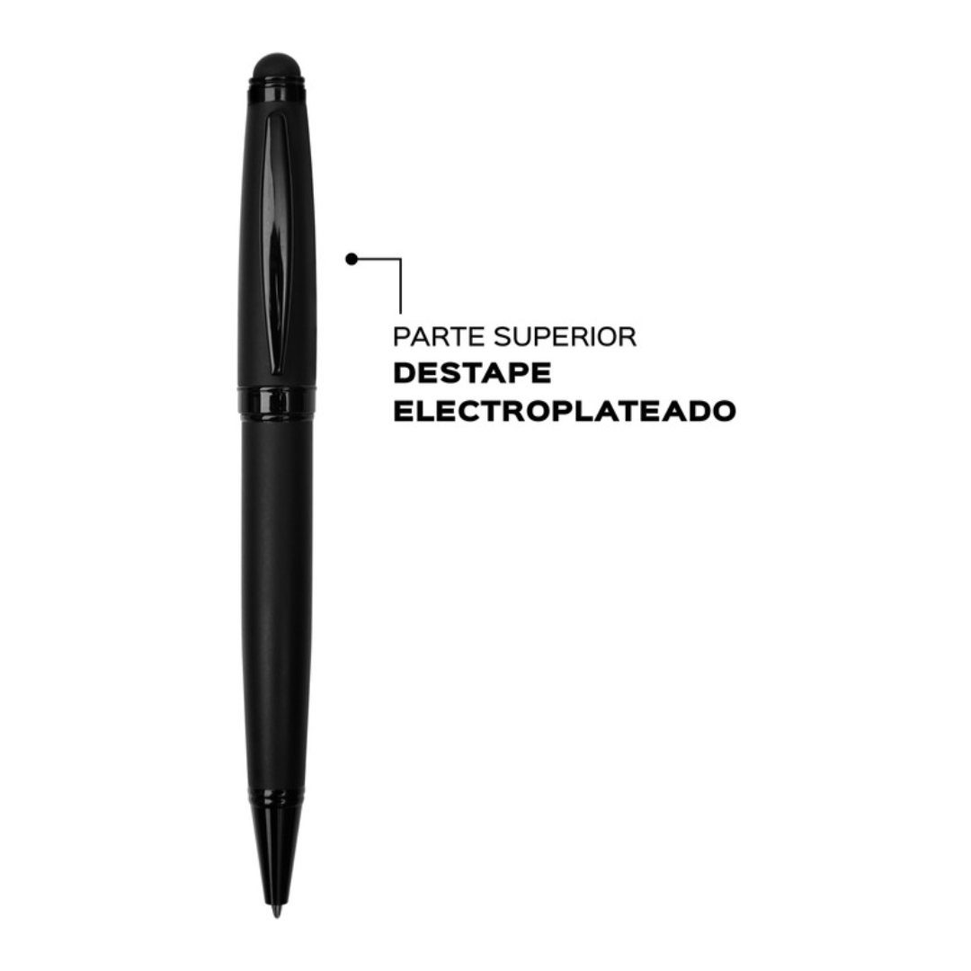Metálico. Bolígrafo touch con apertura giratoria. Destape plateado en la parte superior. Cuerpo color negro mate. Puntera, anillo y clip color negro brilloso. Tinta azul. Estuche de cartón negro.