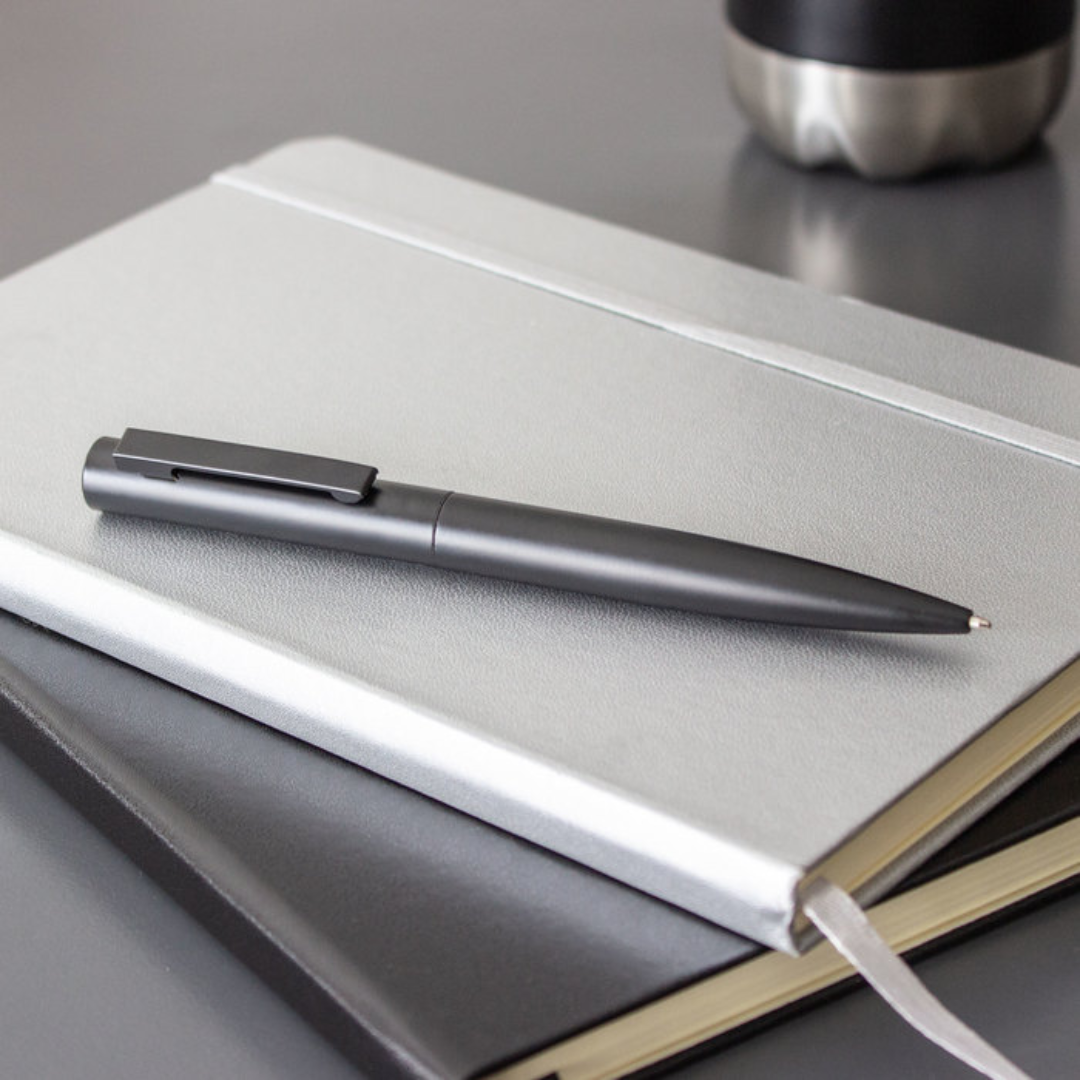 Bolígrafo con apertura giratoria. Cuerpo color negro mate. Puntera, clip y anillo metálico color gris gun. En la parte superior destape electroplateado. Parte inferior texturada para mejor agarre. Recarga metálica.