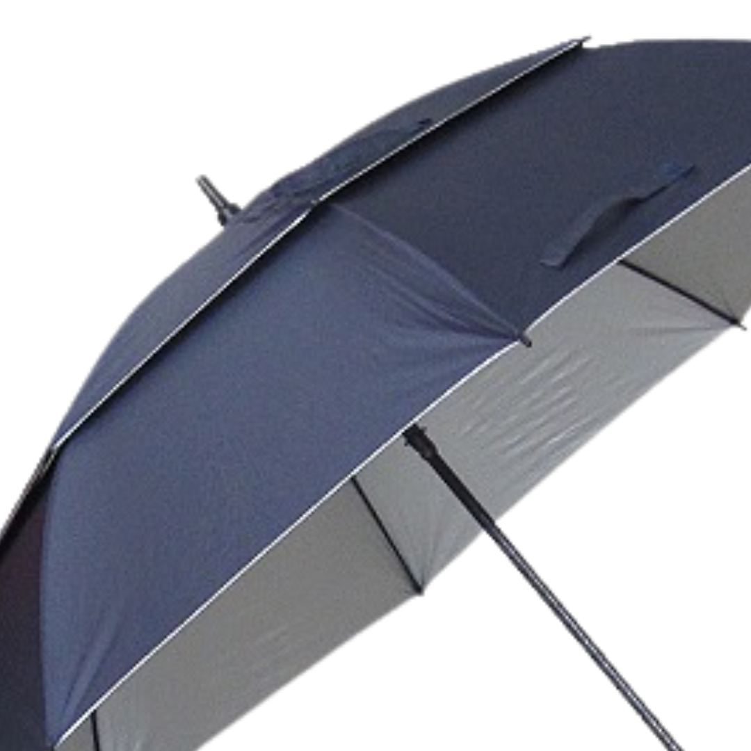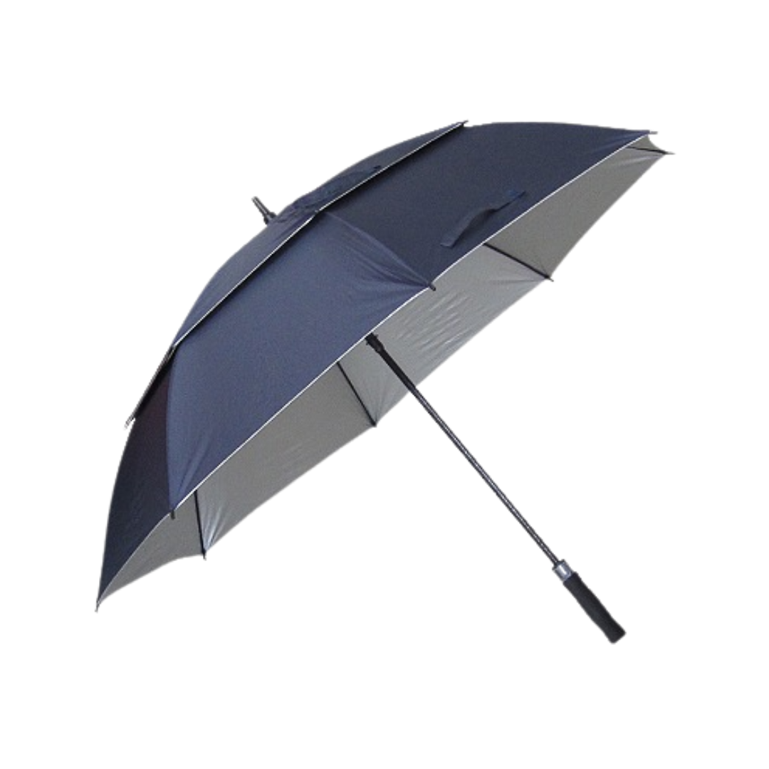 Paraguas de Golf doble capa con apertura automática sistema antiviento. Compuesto por un sistema de ocho varillas dobles de fibra que permite soportar vientos fuertes. Mango ergonómico de foam. Doble tira de cierre. Provee funda.