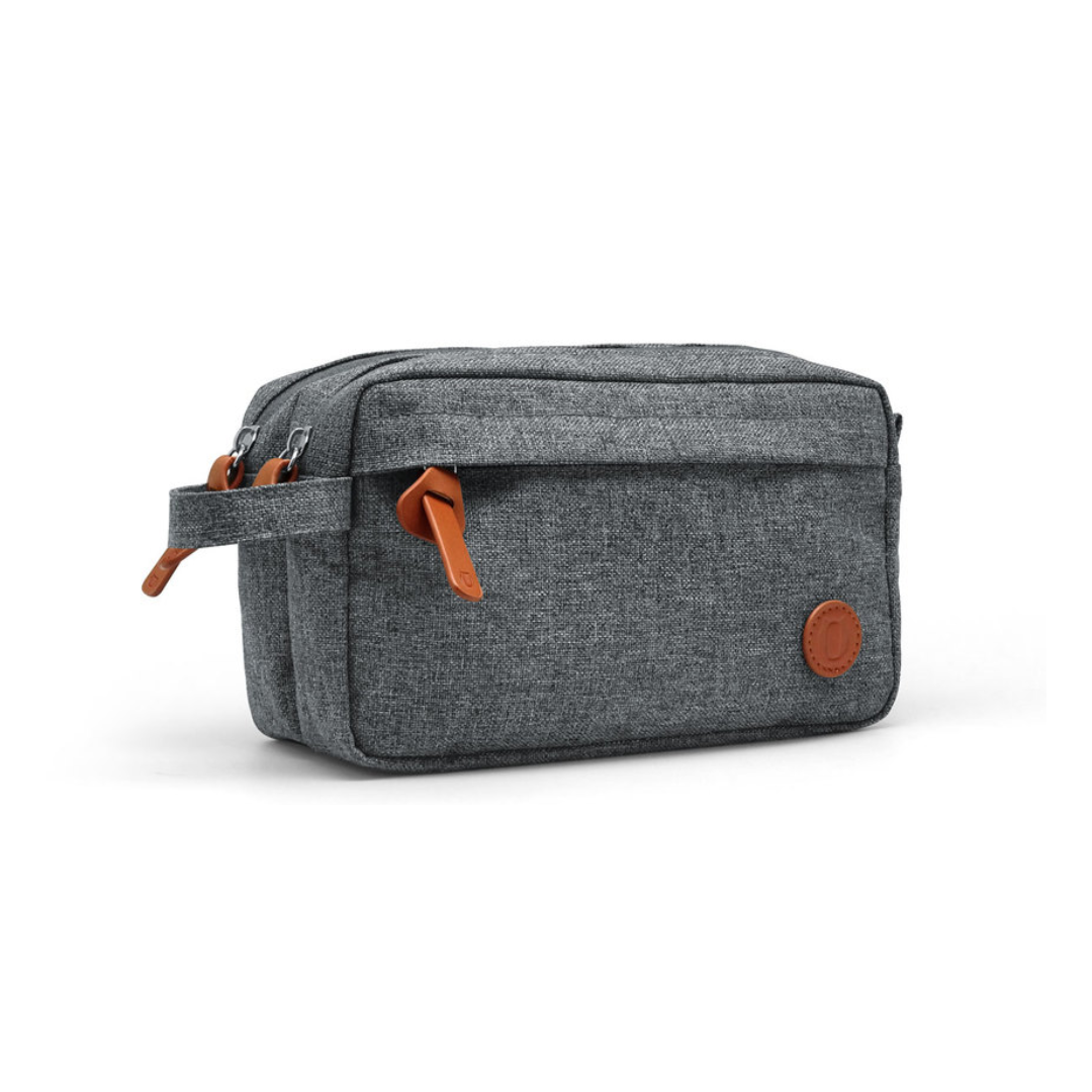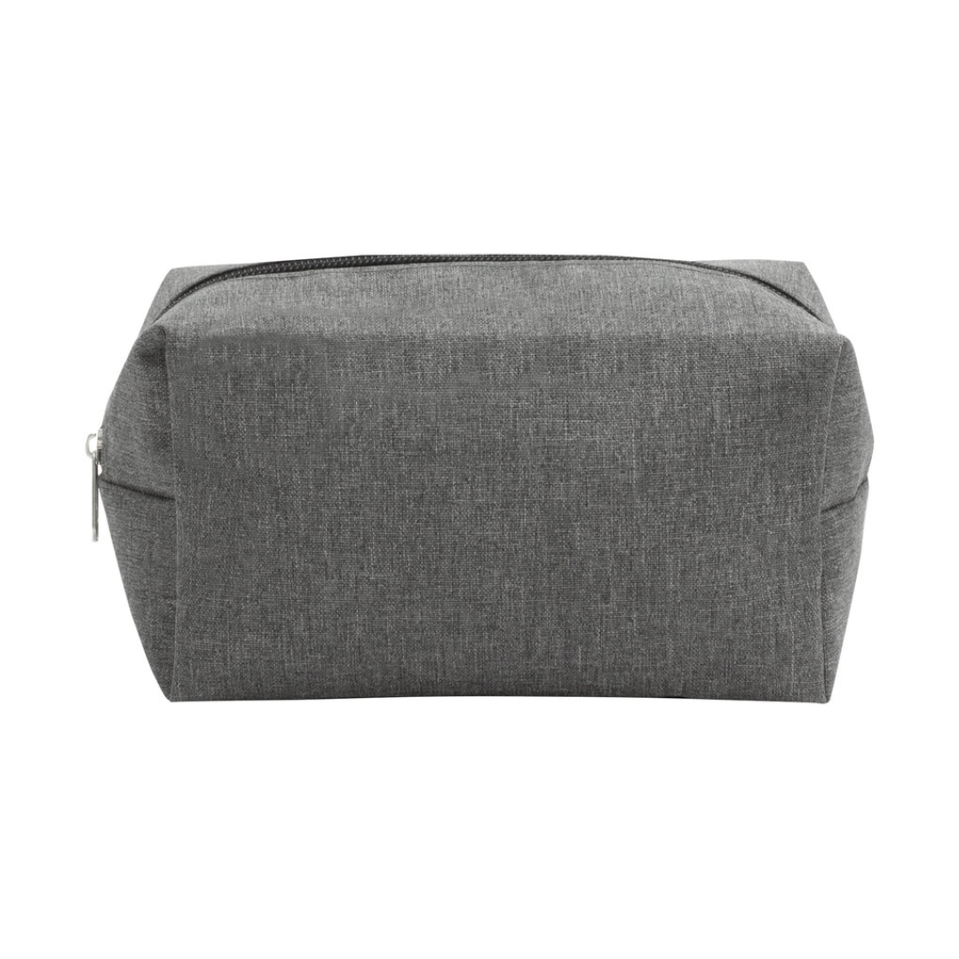 Necessaire con amplio compartimento. Interior forrado en Poliéster 210D. Cierre con tirador metálico y asa lateral en tela de color gris.