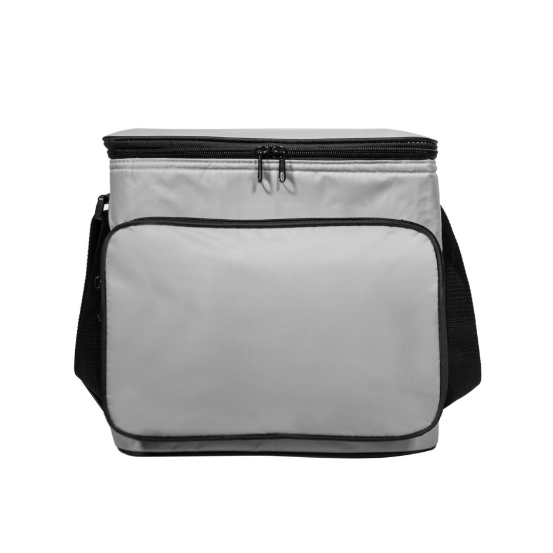 Hielera/cooler con interior recubierto de aluminio y exterior con bolsillo y cierre que permite guardar pequeños objetos. Tira con regulador de tamaño para poderla transportar cómodamente.
