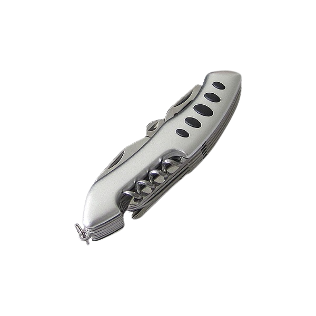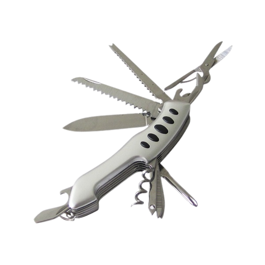 Cortaplumas con 11 funciones. Detalles de goma en cachas. Estuche de cordura.