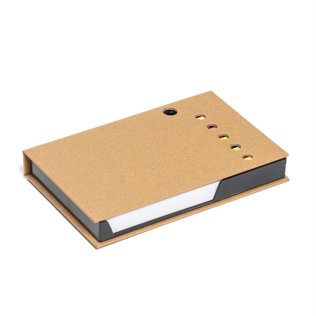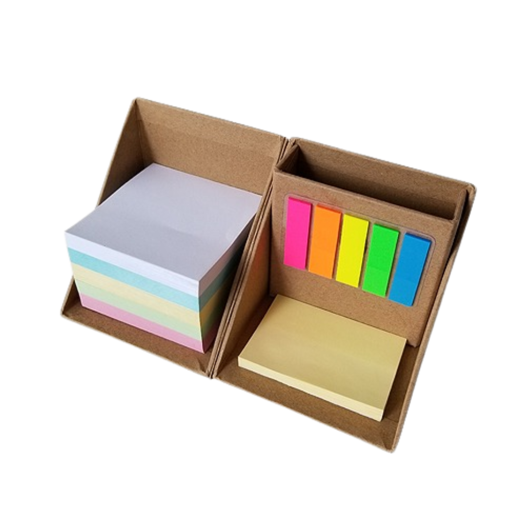 Porta taco ecológico desplegable, queda armado como set de escritorio con porta objetos. Provee un taco principal (100 hojas) de 7.5×7.5cm, taco adhesivo (50 hojas) de 7.5x5cm y kit de señaladores adhesivos (25 x color).