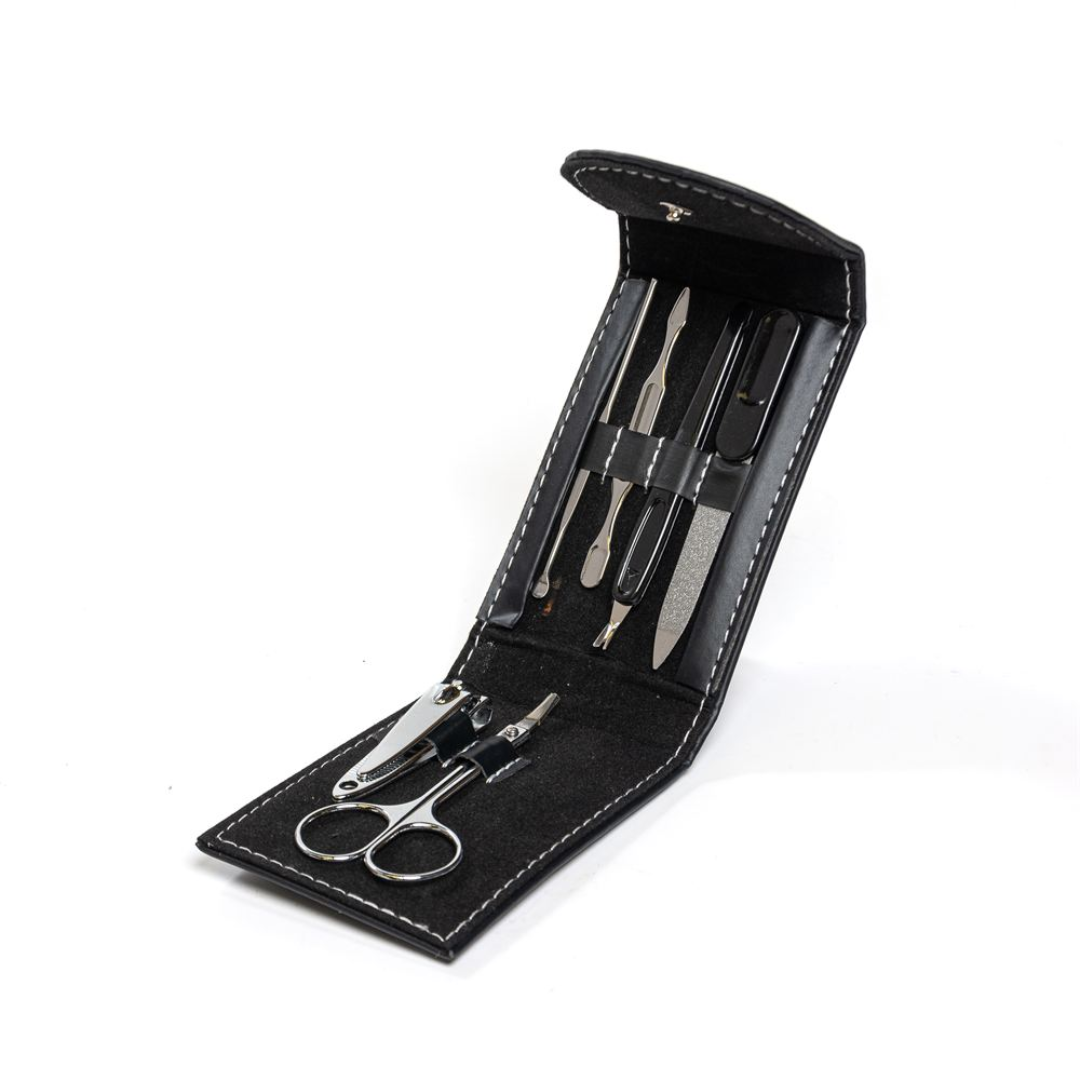 Set de manicura en estuche símil cuero de apertura desplegable, cierre con broche, interior de símil pana, contiene corta uñas, tijera, lima y tres elementos para cutícula.