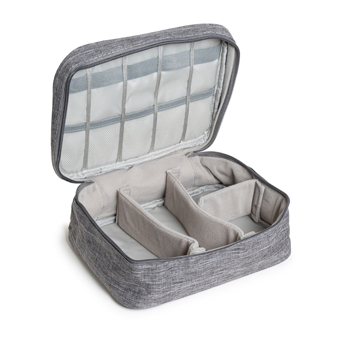 Porta accesorios de electrónica y telefonía. Manija exterior y cierre doble. Paredes acolchadas. Exterior en tela impermeable. Interior forrado con sujeciones para los elementos y tres cintas acolchadas con velcro para asegurar las piezas.