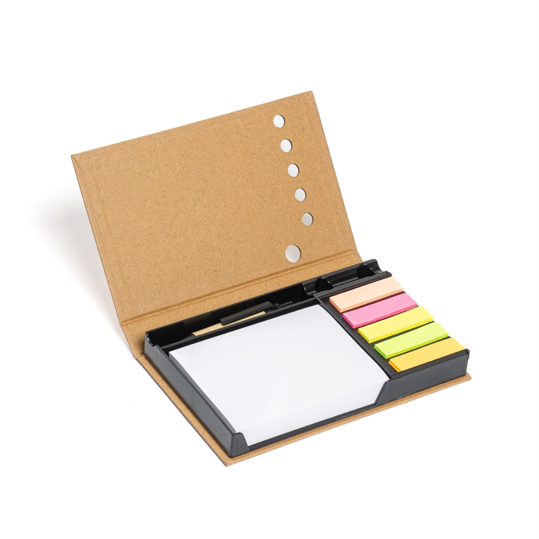 Porta taco con bolígrafo ecológico. Apertura desplegable de cuatro solapas. Contiene taco adhesivo central, taco adhesivo lateral (menor tamaño), señaladores adhesivos y taco tipo libreta lateral, también el bolígrafo en su contenedor.